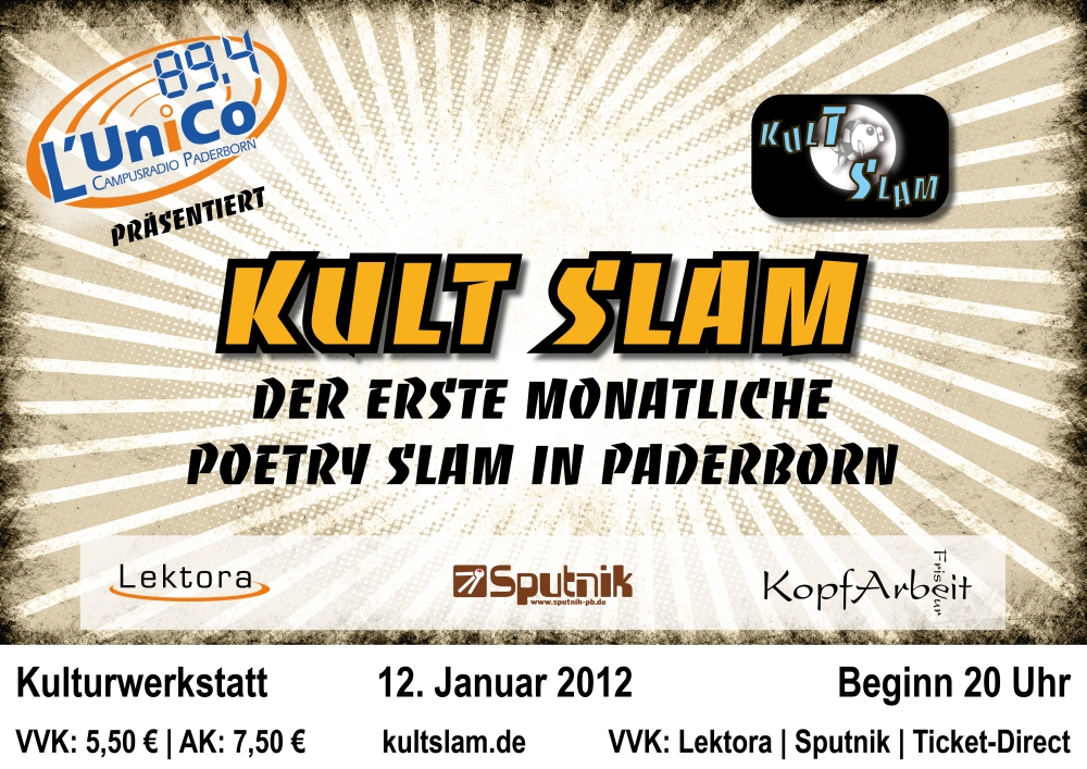 Im Dezember 2012 geht angeblich die Welt unter. Wenn das mal kein Grund zur Freude ist, bedeutet es doch, dass noch ein ganzes Jahr Kult Slam vor uns liegt. Am 12. Januar rocken wieder einige der besten deutschsprachigen Poetry-Slammer die Kulturwerkstatt: 6 Minuten bleiben den Poeten für ihre Performance, 6 […]